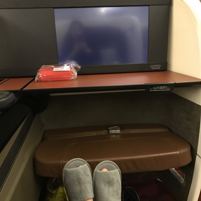 一般的なファーストクラスの座席は、周りを囲むように目隠しがあり、プライベート空間を保てるようになっていました。一方で、その上を行くスイートクラスは、周囲の壁に加えて扉までついています。ただ、天井まで仕切りがある訳でなはなく、上部は開いています。とはいえ、180cmくらいの高さがあるため、ほぼ個室になっていると言っていいでしょう。まるで、ホテルの一室にいるかのような雰囲気です。