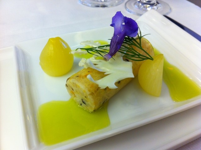- 席に座ると、まずドリンクサービス。機内食は一流シェフのコース料理を堪能できる
