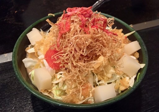 具を最初に焼いて端に寄せ、汁を鉄板全体に広げてパリパリに焼く、もんじゃせんべいと呼ばれる焼き方もあります。