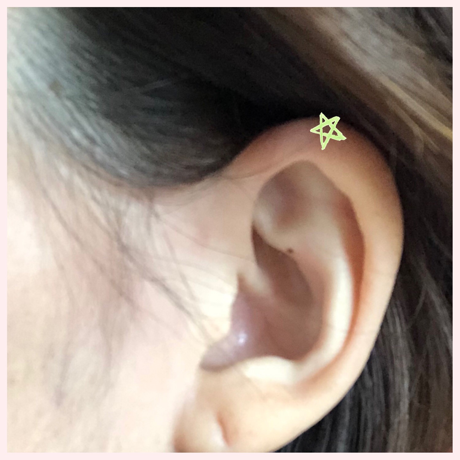 耳の上部内側の山折になっている部分へのピアッシングです。